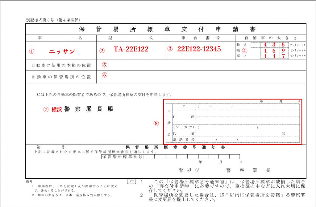 Application form of car storage location sticker issuance “Hokanbasho Hyoushou Kouhu Shinseisho” (保管場所標章交付申請書) is kind of an exchange ticket to receive “car storage location sticker”, which you attach on the rear glass.
